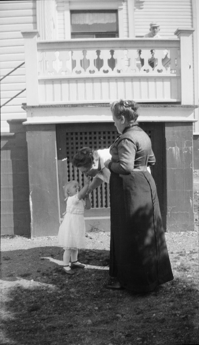 Christiane och Marit Liljefors samt Christianes mor Pauline Egelind Petersen framför huset "Grönvold", Christiane Liljefors föräldrahem, på verandan en av sönerna, Stavanger, Norge