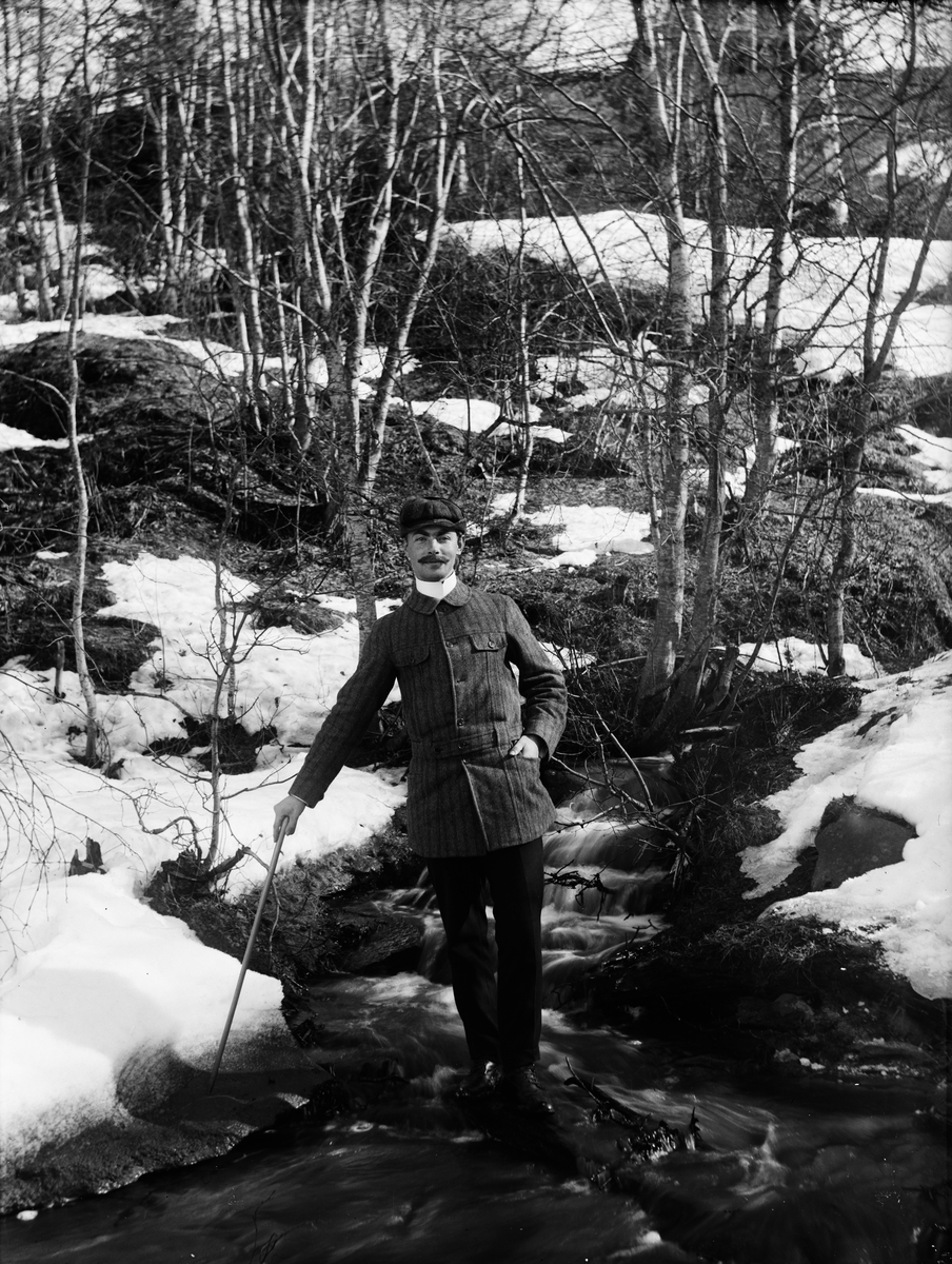 Josef Ärnström på sten i bäck, sannolikt Kiruna, Lappland