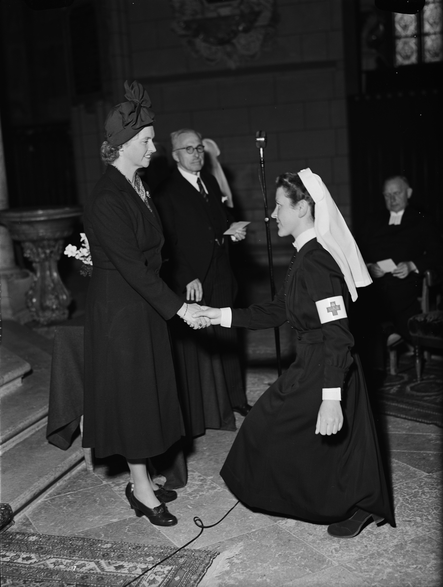 Gulli Gunnarsson får sjuksköterskebroschen av prinsessan Sibylla, Uppsala sjuksköterskehems sjuksköterskeskolas sköterskeinvigning i Uppsala domkyrka