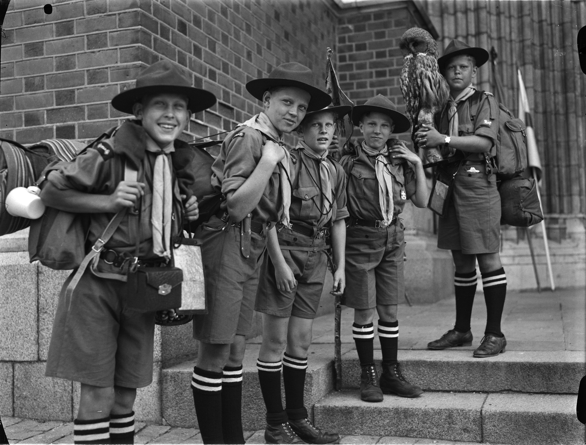 En scoutpatrull ur Uppsala kyrkliga scoutkår med sin symbol ugglan utanför Uppsala domkyrka