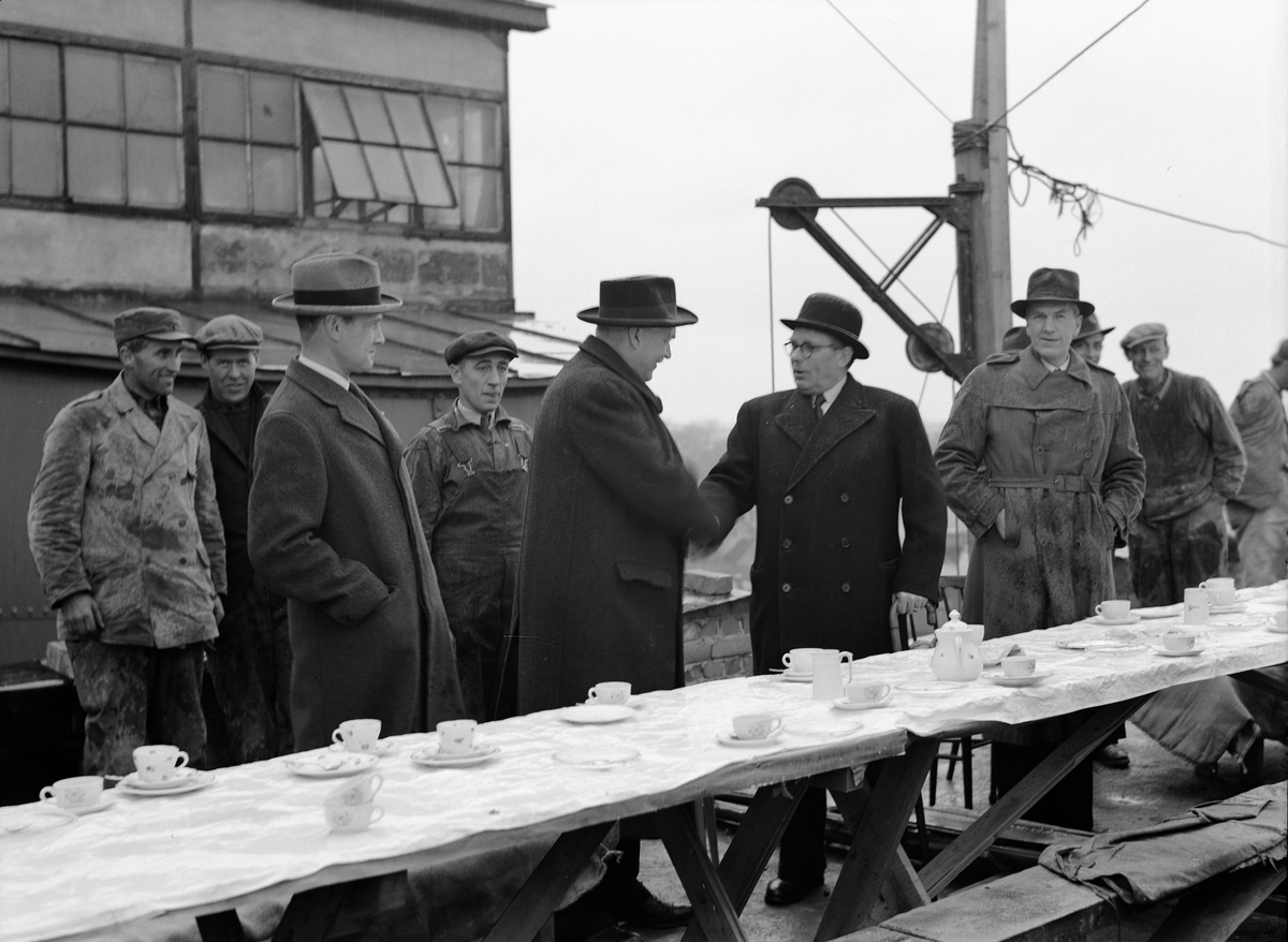 Byggmästaren Anders Diös vid taklagsfirande, Uppsala 1945