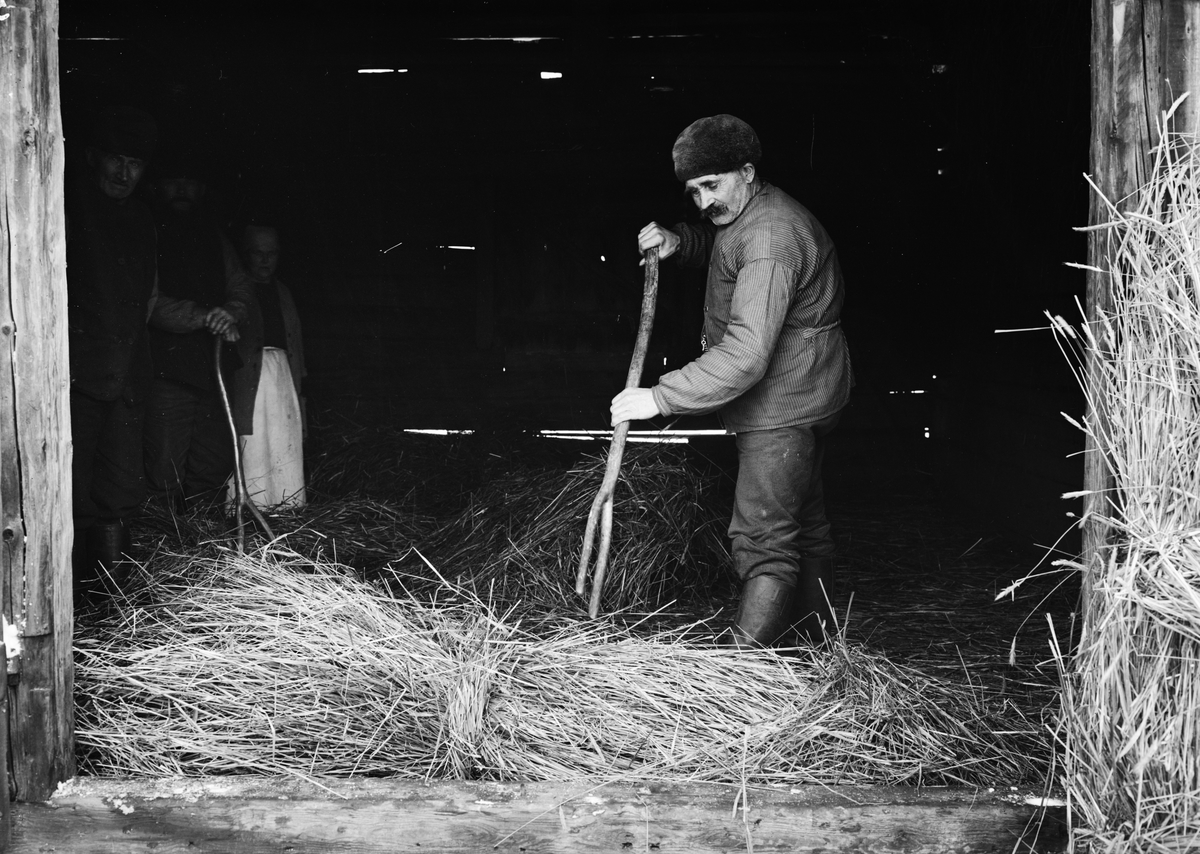C V Rönnqvist visar hur långhalmskärven "skäktas" med "tjyva" sedan "svepen" bundits, Villsberga, Biskopskulla socken, Uppland