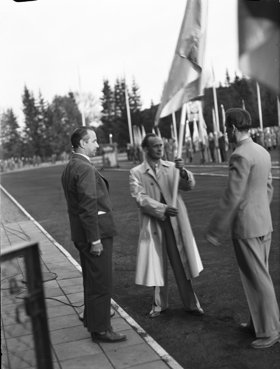 Uppsala Arbetarekommuns ordförande Einar Eriksson tog emot Svenska flaggan av borgmästare Bertil Hagström under nationaldagsfirandet på Studenternas Idrottsplats