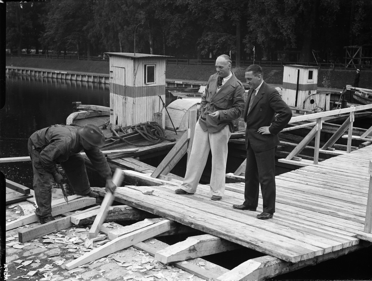 Kapten Eric Brodd och dekoratör C Mörner på den provisoriska bron över Fyrisån som byggdes till Barnens Dagsfirandet på Hamnplan och i Stadsträdgården/Flusterparken
