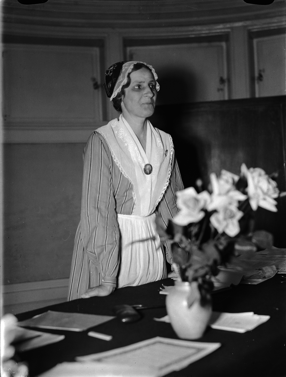 Eleonor Lilliehöök talar när Uppsala läns Husmodersförbund har möte i Fackskolan för huslig ekonomis stora sal, Trädgårdsgatan 14