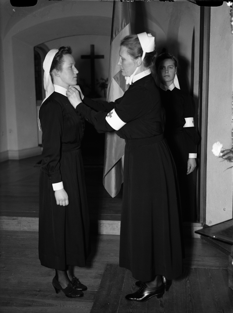 Föreståndarinnan vid Akademiska sjukhusets sjuksköterskeutbildning Elisabeth Dillner fäster broschen på en nyutexaminerad sjuksköterska, Akademiska sjukhuset sjuksköterskehem