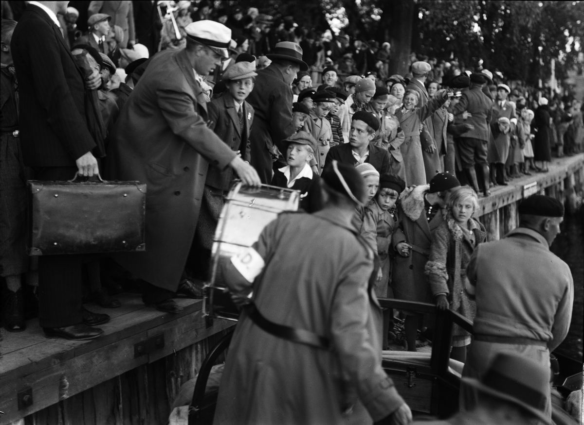 Trängsel när barn går ombord på motorbåtar som ska ta dem till "Barnens ö" vid Liljekonvaljeholmen, Fyrisåns strand, Stadsträdgården