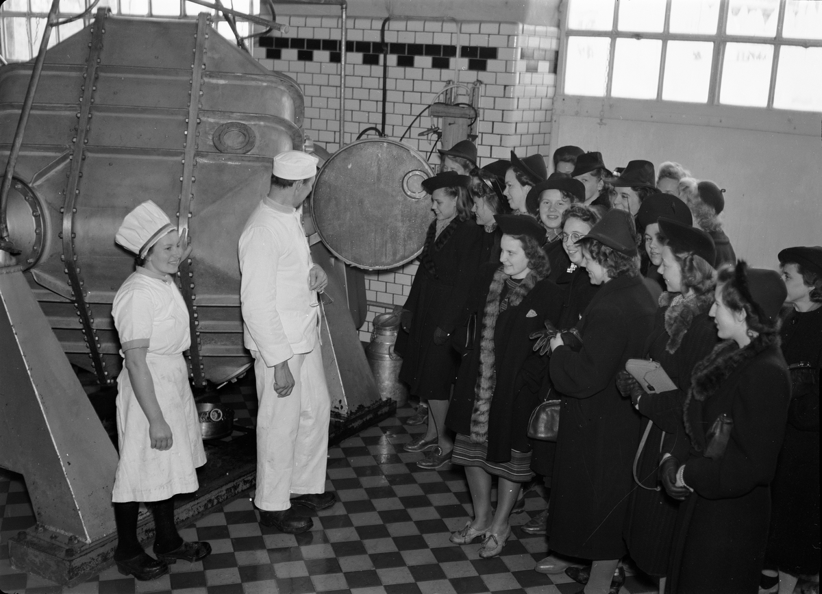 Ungdomar som deltar i en studiedag anordnad av Hushållningssällskapet och en kommitté för kvinnlig samhällstjänst studerar smörkärnan vid Mjölkcentralen, Storgatan 19