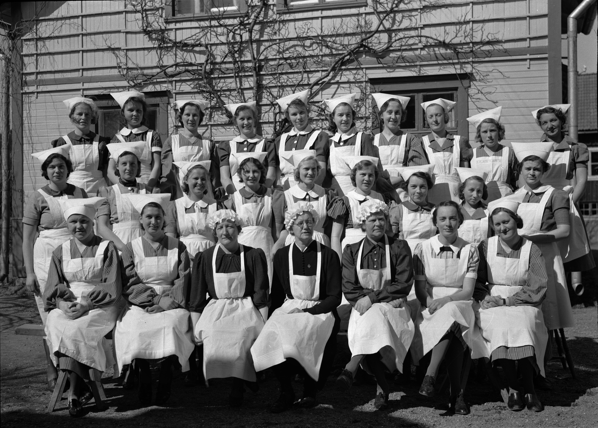 Kursavslutning på Kumlans Lanthushållsskola - kursdeltagarna grupperade kring lärarinnorna Anna Johansson, föreståndarinnan Elsa Lundell och Jenny Blomqvist