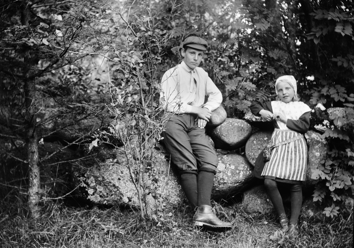 Ruben och Christiane Liljefors ena son och dotter Marit står vid stenmur, sannolikt Svensgården, Dalarna