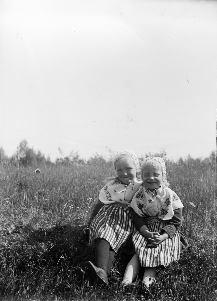 Marit Liljefors med en annan flicka, klädda i folkdräkt, sitter på ängen, sannolikt i Sverige