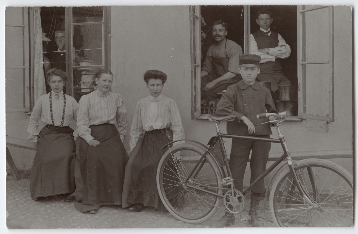 Postkort - personalen på hattfabriken Aug. Ekströms Eftr. samlade utanför fabriken på Svartbäcksgatan 8, Uppsala 1907