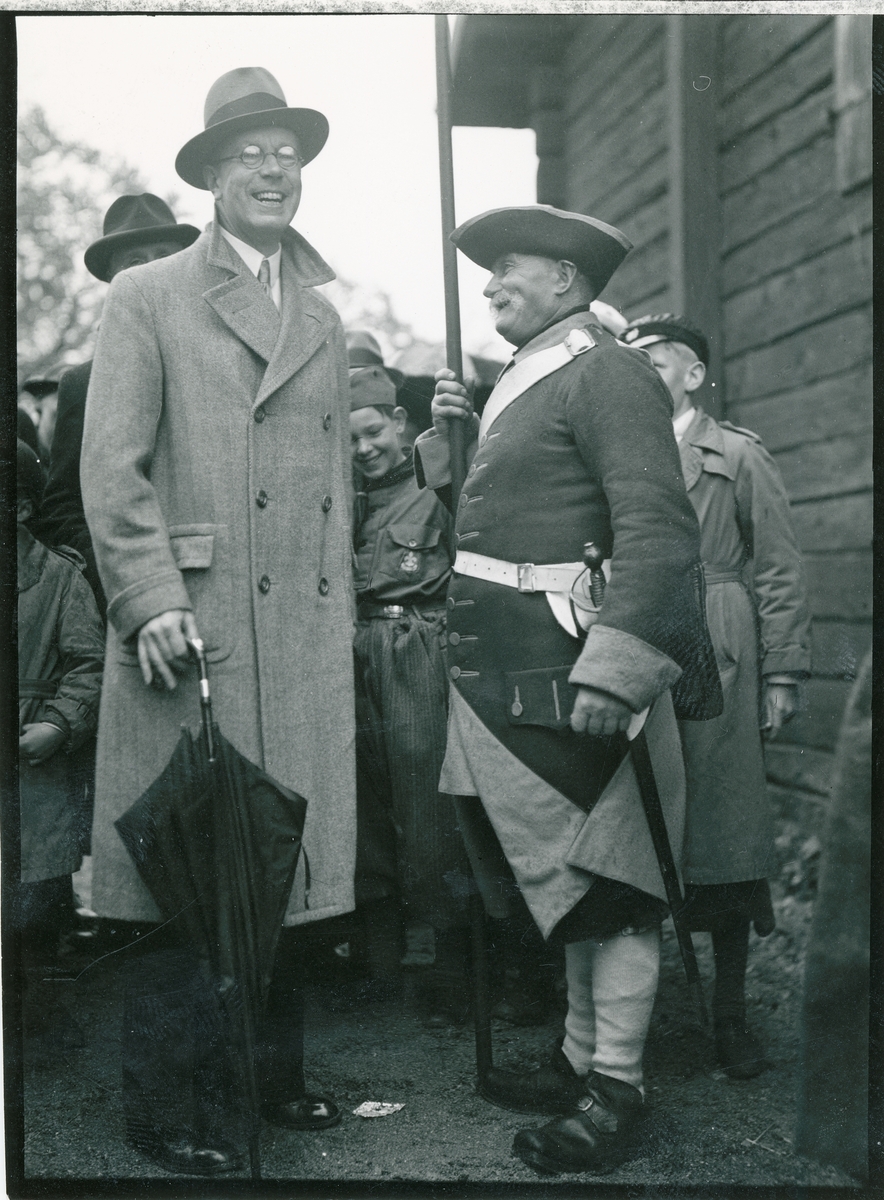 Kronprins Gustav VI Adolf och en man i karolineruniform, Härkeberga, Uppland 1936