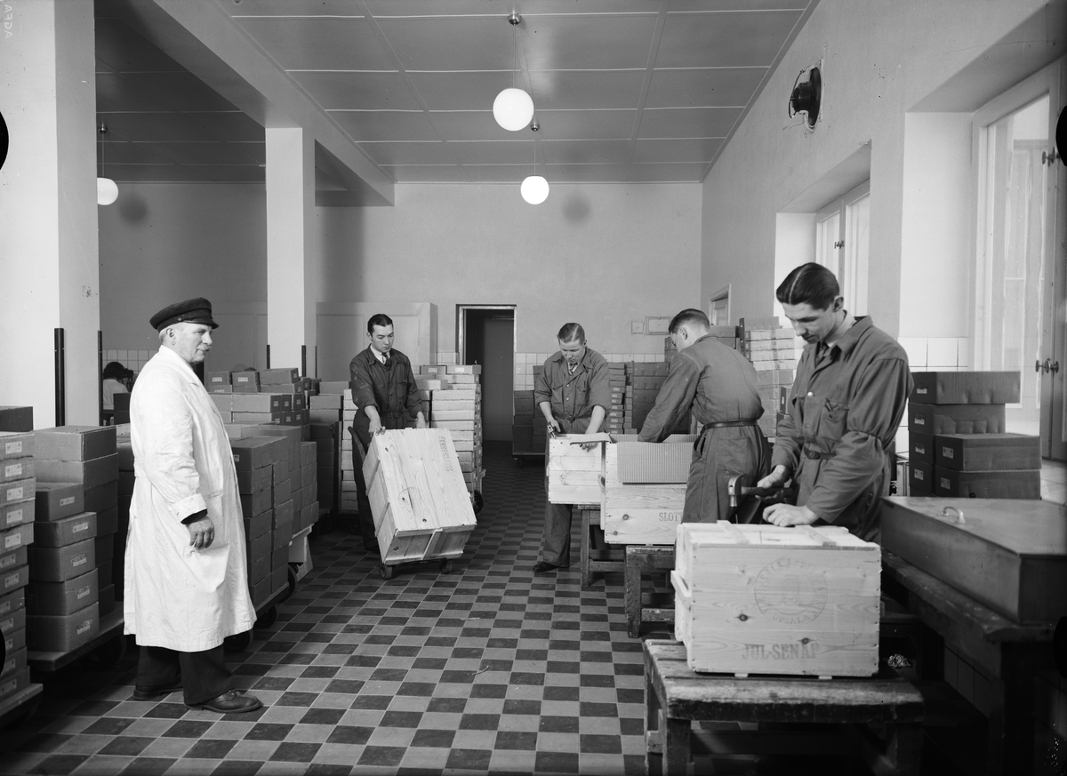 Industriarbetare och förman i lokal där senapsburkar förpackas i trälårar, AB Upsala Ättiksfabrik, S:t Persgatan 39
