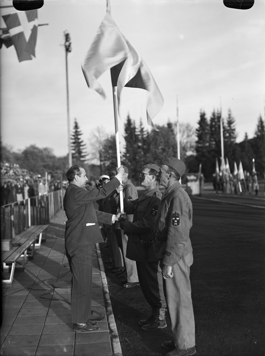 Överlämning av fana under nationdagsfirandet på Studenternas Idrottsplats