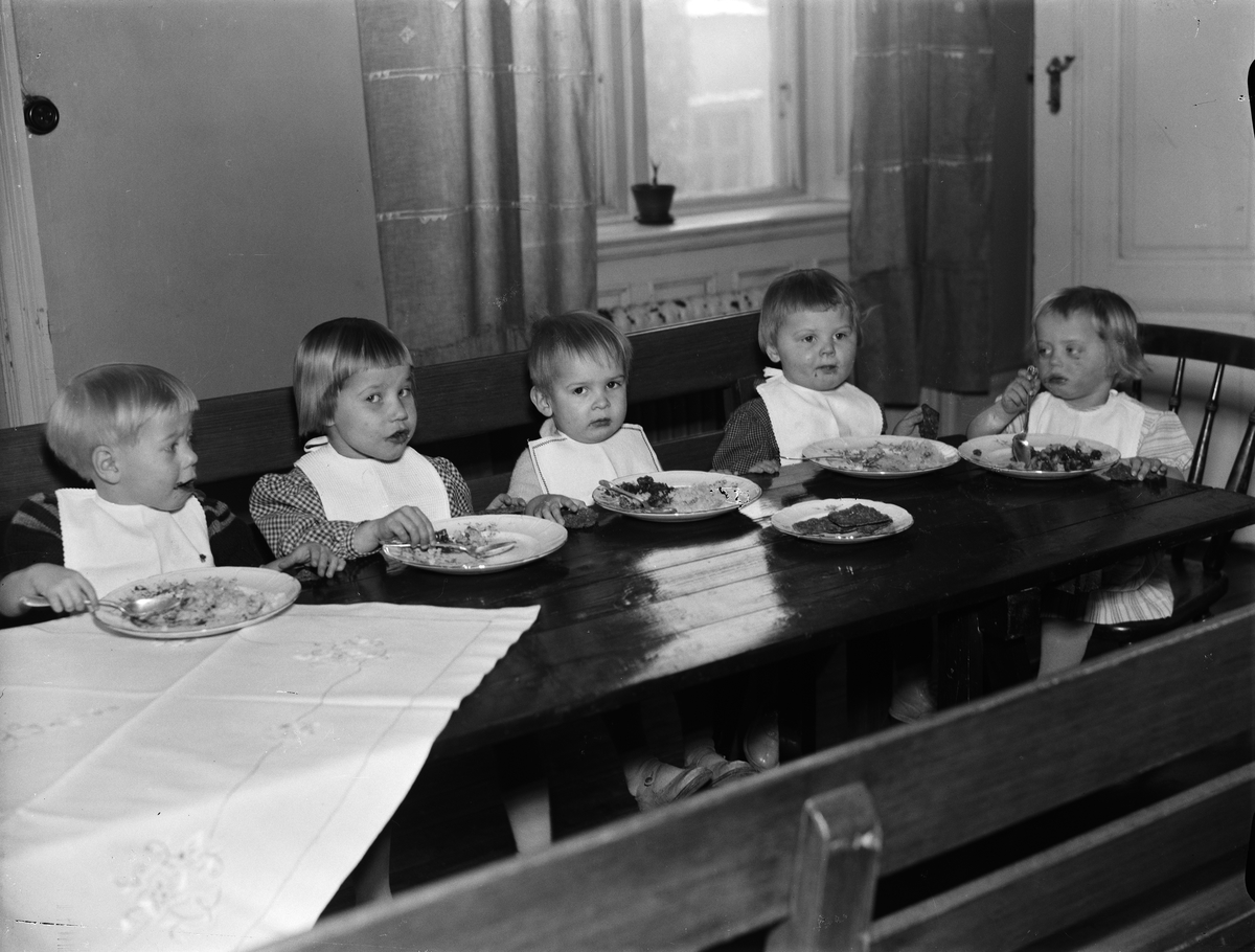 "Småttingarna till bords" på Uppsala domkyrkoförsamlings barnhem för finska flyktingbarn, Uppsala mars 1942