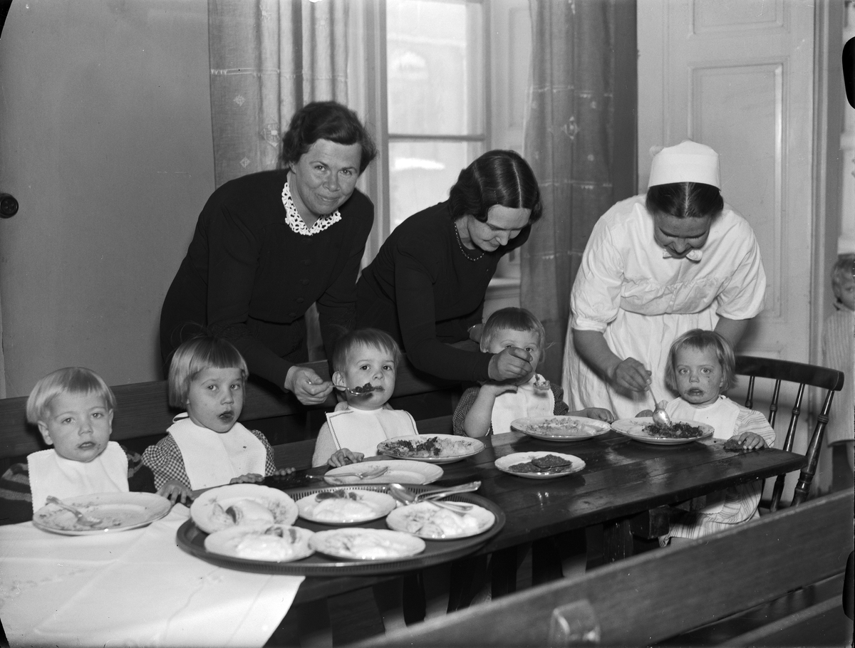"Småttingarna till bords" på Uppsala domkyrkoförsamlings barnhem för finska barn, Uppsala mars 1942