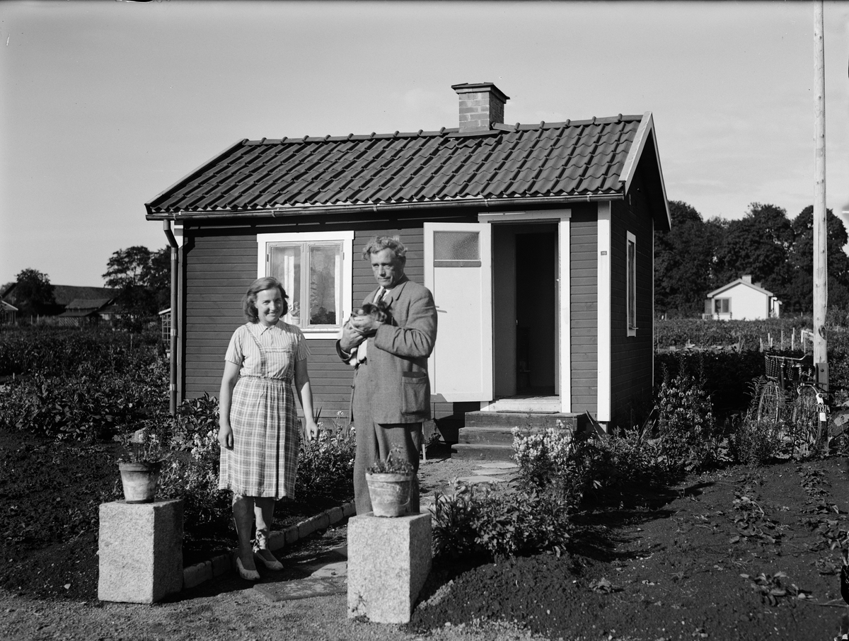 Tunabergs koloniträdgårdsförenings ordförande, ombudsman Karl Axel Åberg med fru Lagerkvist framför hennes kolonistuga i Tunabergskolonin, Tuna backar
