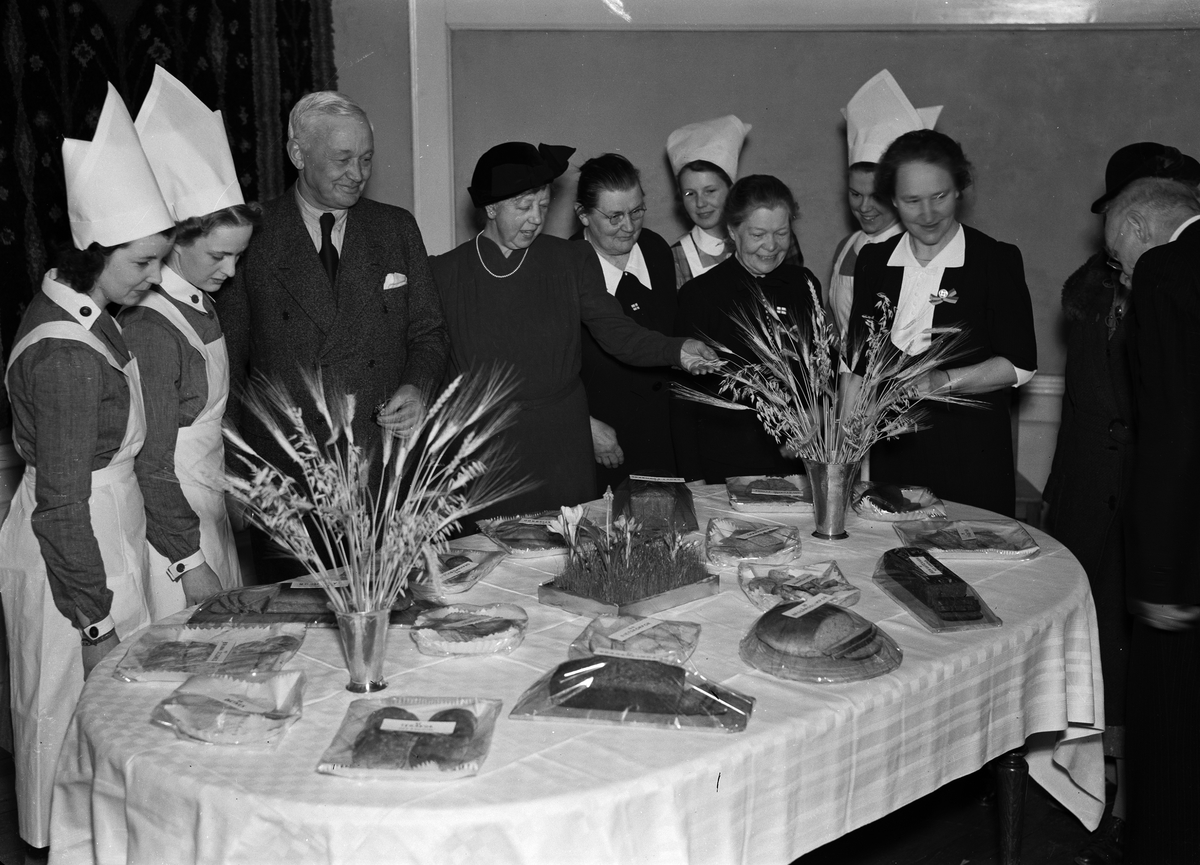 "Bordet med fullvärdigt bröd beundras" på Fackskolan för huslig ekonomis utställning i samband med en hushållkurs om vardagsmat i kristid, Trädgårdsgatan 14