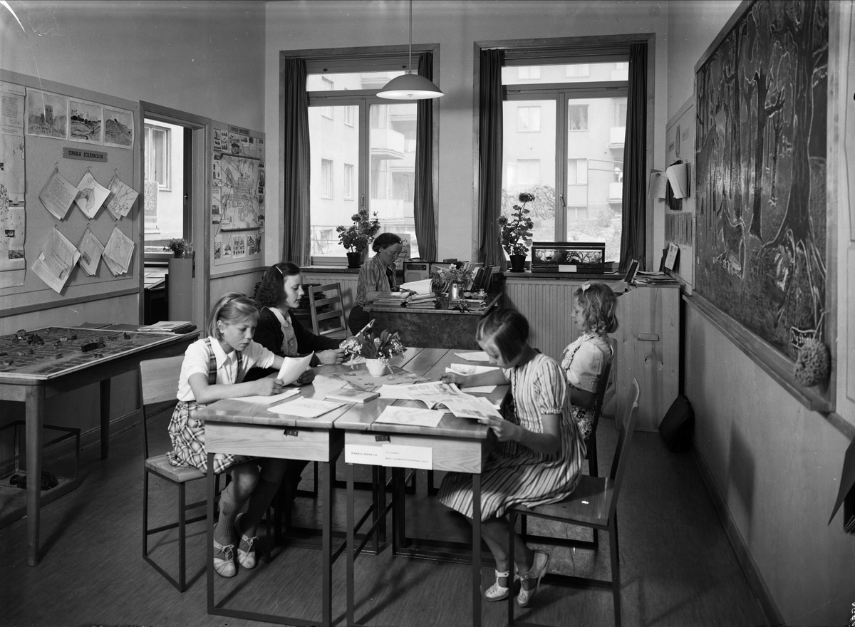 Folkskolans 100-årsjubileum - skolelever och läraren Gärda Brunskog i klassrum