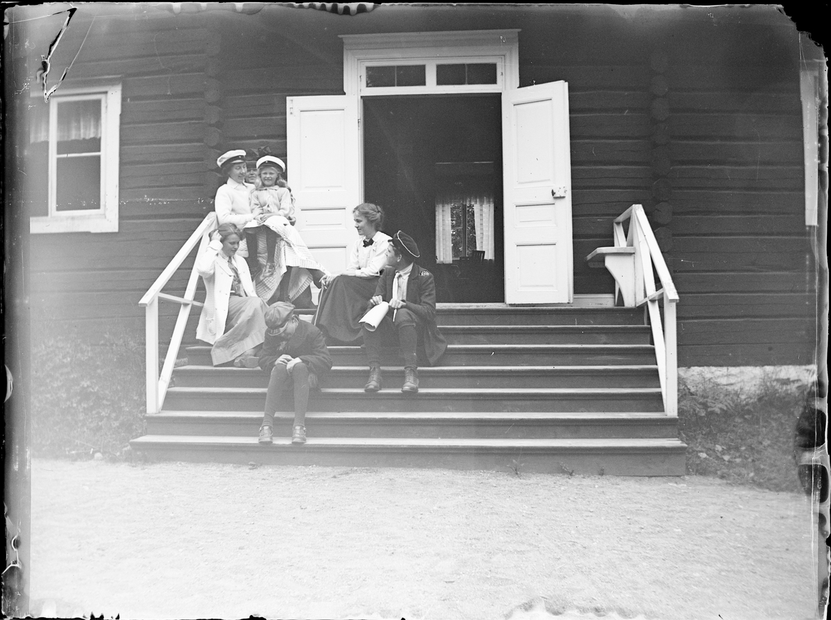 Människor sitter på trappan till ett hus, Sätra brunn, Sala