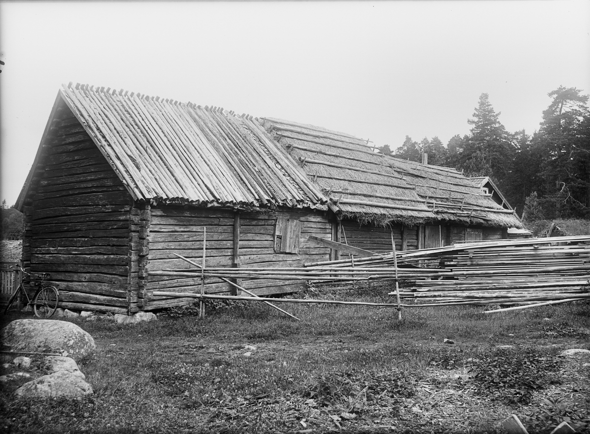 Bodlänga med vedtak och halmtak - J G Olsson, Brunnmossen, Hållen, Hållnäs socken, Uppland, sannolikt 1930-tal