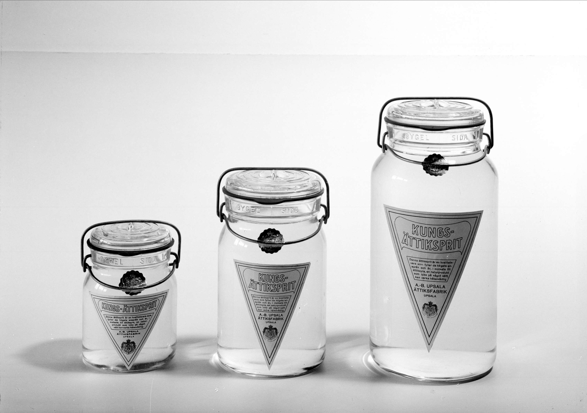 Glasburkar med Kungs-ättiksprit från AB Upsala Ättiksfabrik, S:t Persgatan 39, Uppsala 1937
