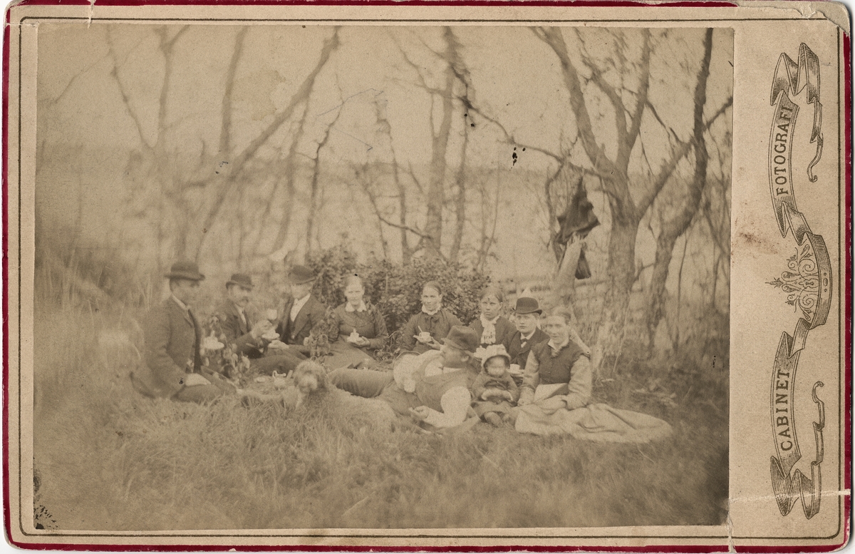 Kabinettsfotografi - kvinnor, män, barn och hund på picknick, sannolikt Tierp, Uppland