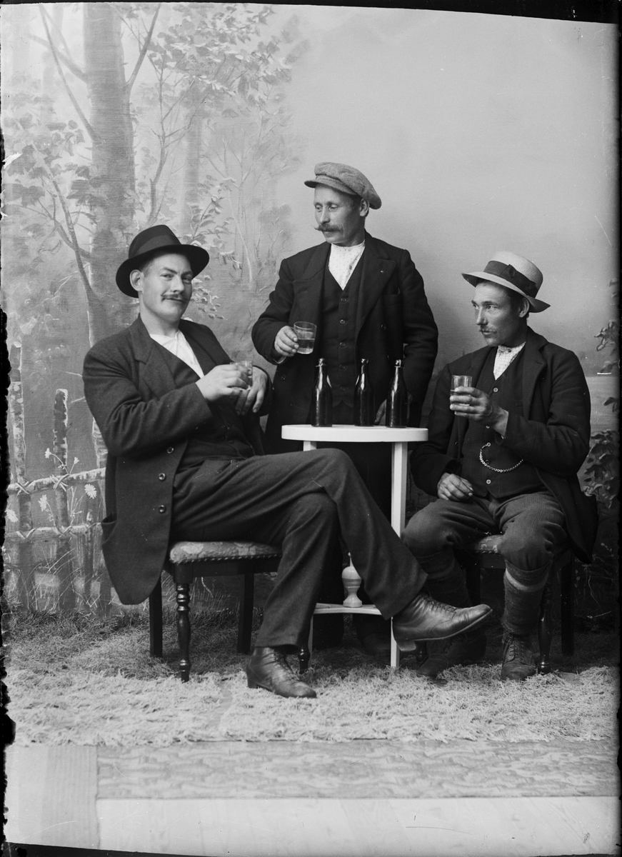 Ateljéporträtt - tre män med varsitt glas i handen, Östhammar, Uppland