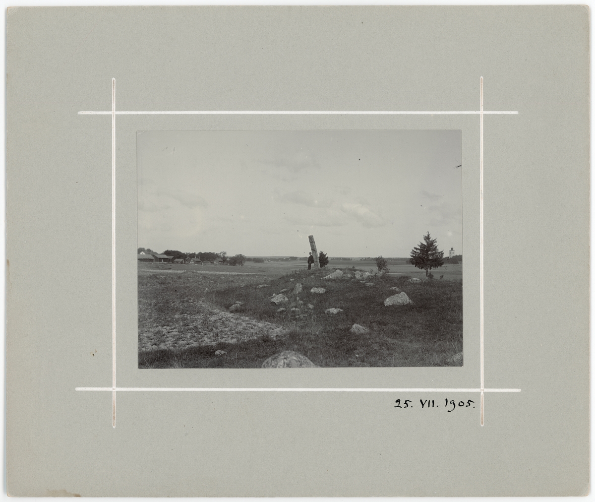 En man står vid en rest sten, Altuna socken, Uppland 1905