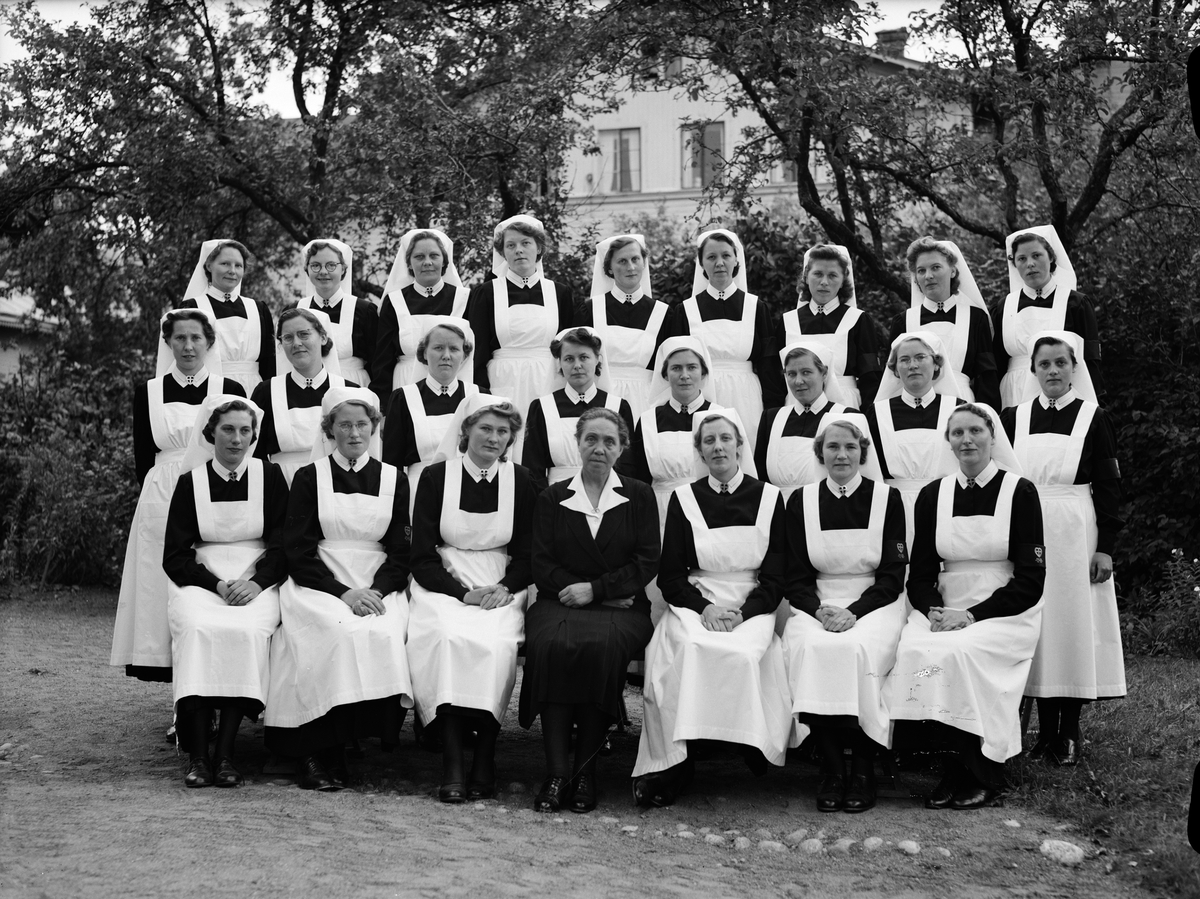 Grupporträtt - hemsystrar, sannolikt vid Uppsala stads hemsysterskola, Odensgatan 16, Uppsala 1942