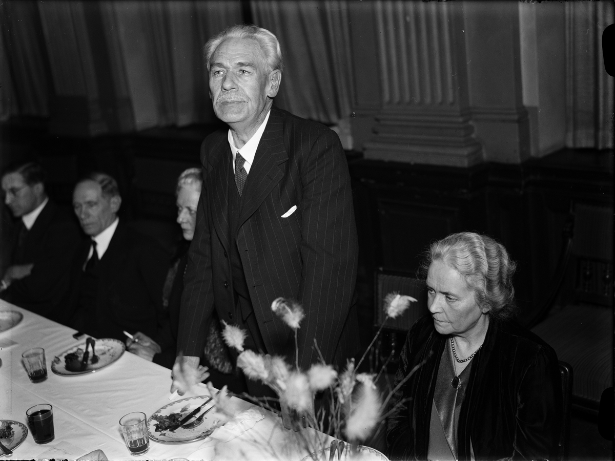 "Upländsk hembygdsrörelse står starkare än någonsin" - "generaldirektör Sam Larsson utbringar de tre folklandens skål" på Disagillet, Östgöta studentnation, Trädgtådsgatan 15, Uppsala 1943