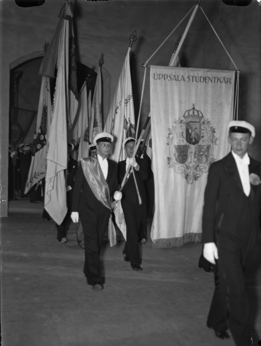 Fanbärare från Uppsala Studentkår tågar in till vårfesten i Rikssalen på Uppsala slott