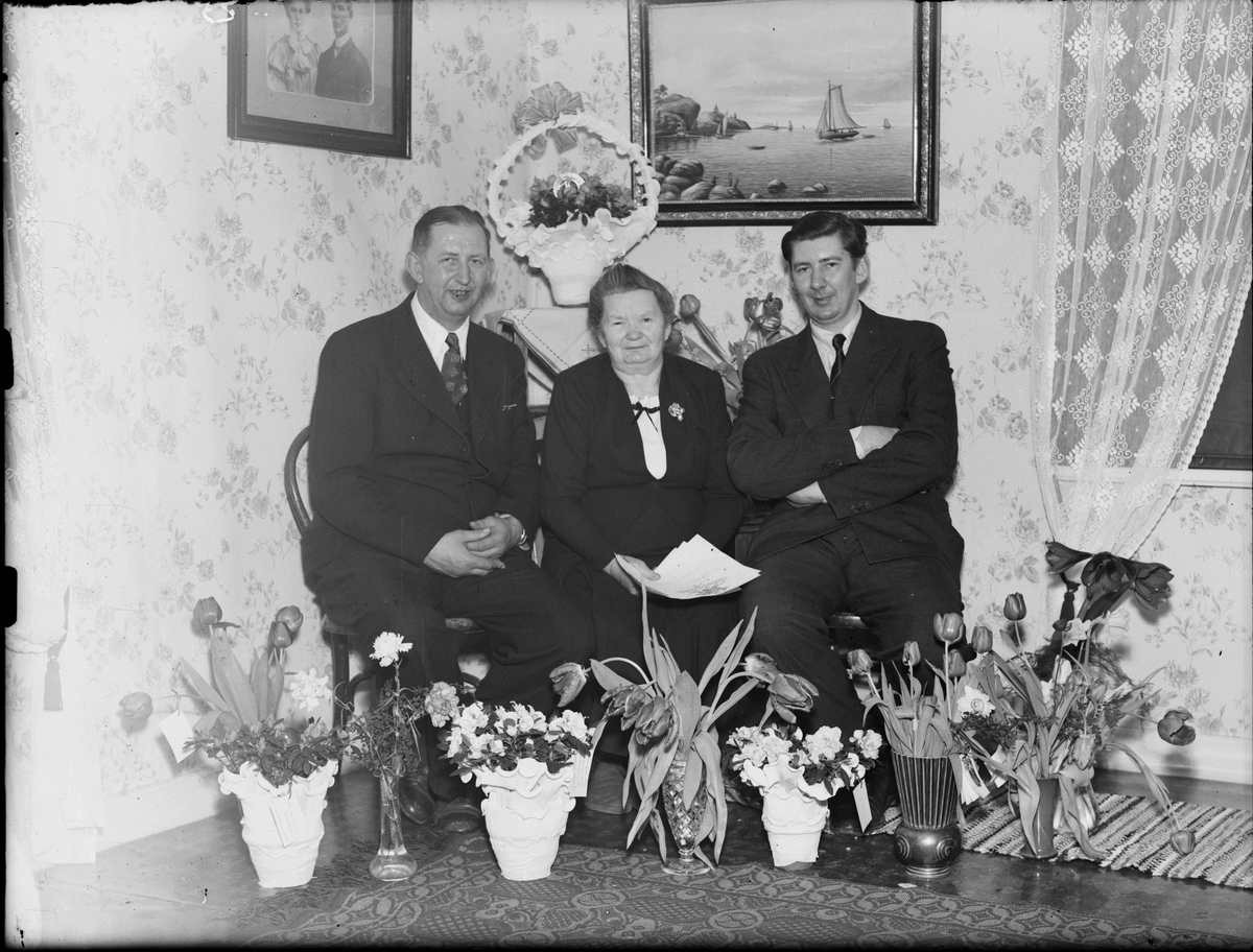 Hotellägare Ivar Janssons fru och två män omgivna av blommor, Östhammar, Uppland