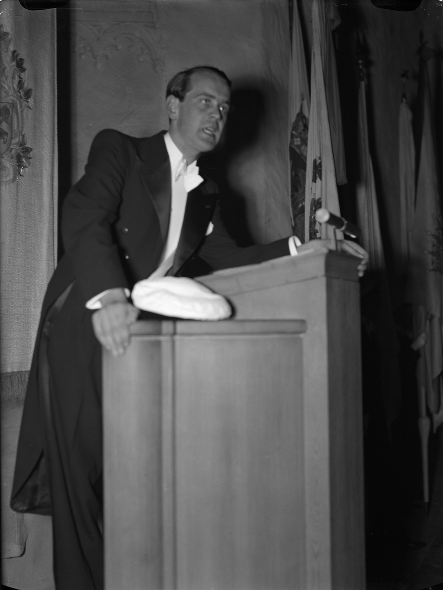 Filosofie kandidat Gösta Folke "håller talet till kvinnan" på Uppsala Studentkårs vårfest i Rikssalen, Uppsala slott