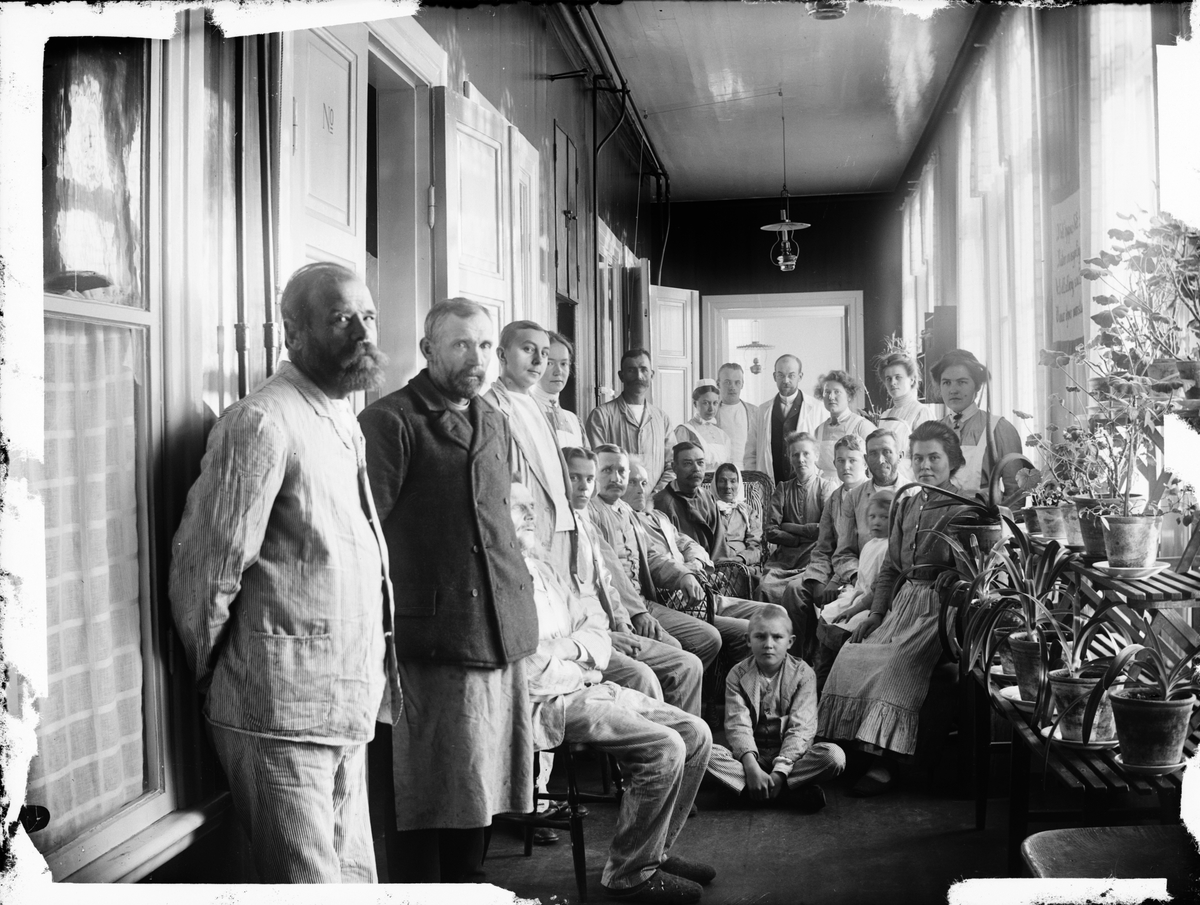 Sjukvårdspersonal och patienter i korridor, Östhammars lasarett, Uppland