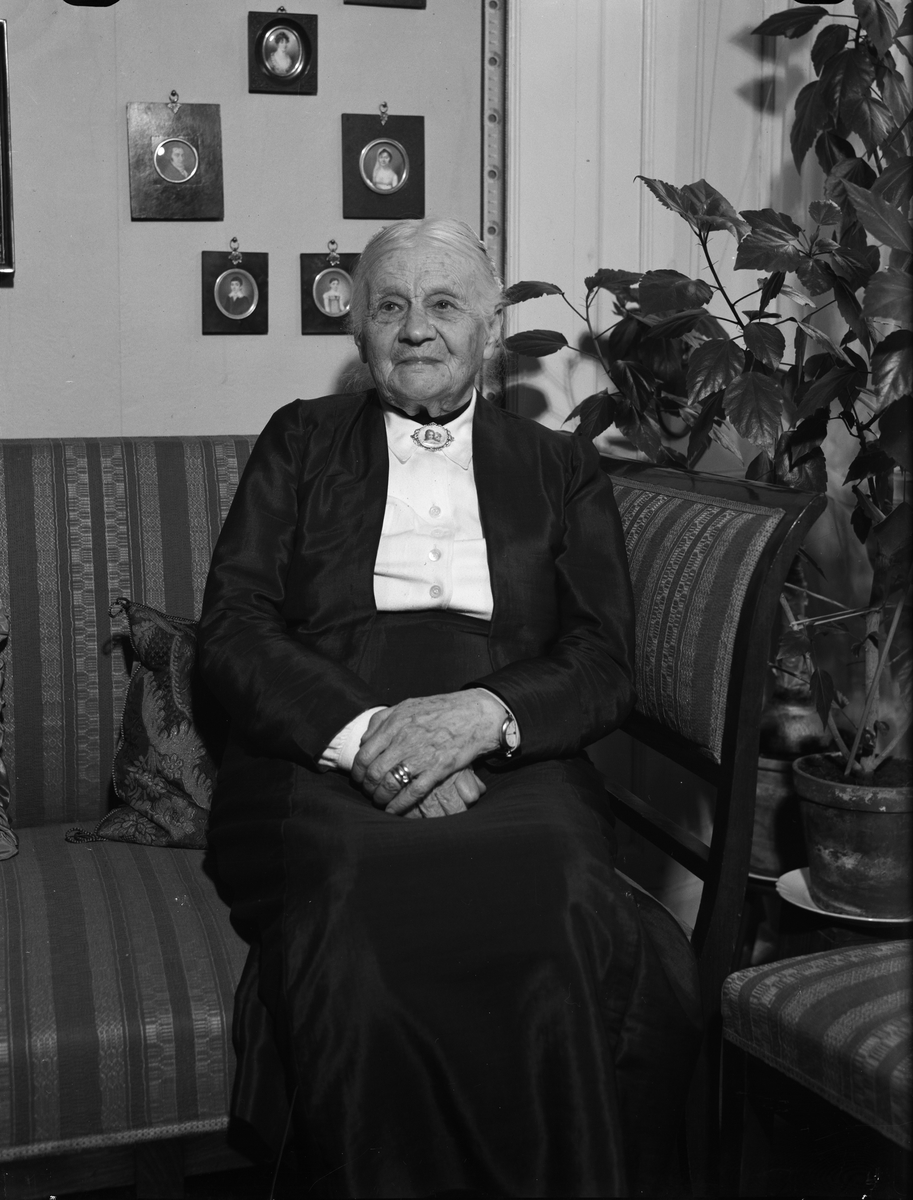 Äldre kvinna i hemmiljö, sannolikt Uppsala, 1947