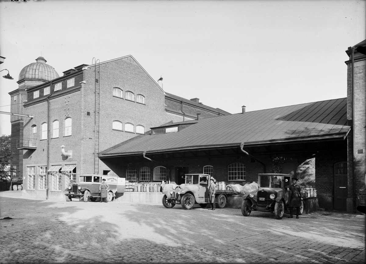 Lastbilar utanför Mjölkcentralen i kvarteret Tor, Uppsala