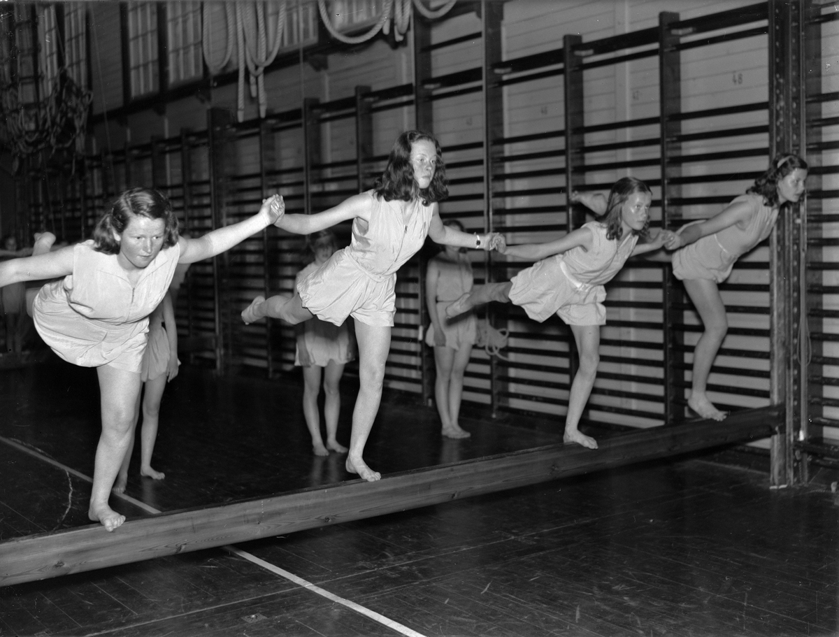 Elever gör en balansövning på bommen i "Svettis", Studenternas gymnastikhus