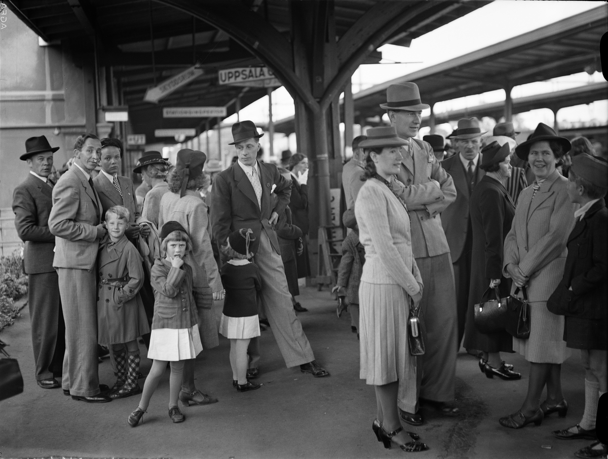 Titel: "Upsala ångqvarns personal på utfärd till Furuvik", från avfärden på Uppsala centralstation, Uppsala 1942