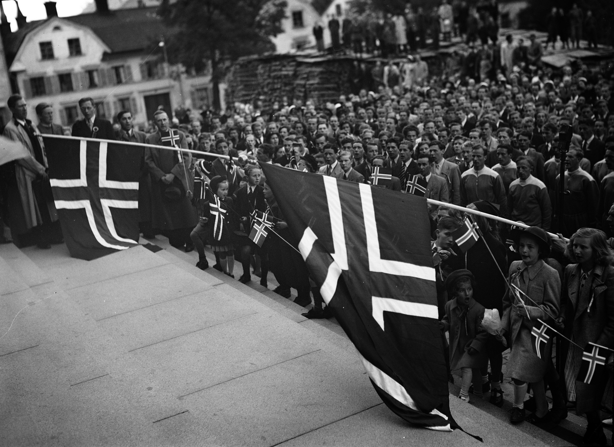 "Fanorna ha sänkts till parad, medan man sjunger 'Ja vi elsker'" vid 17 maj-firandet framför Universitetshuset trappa