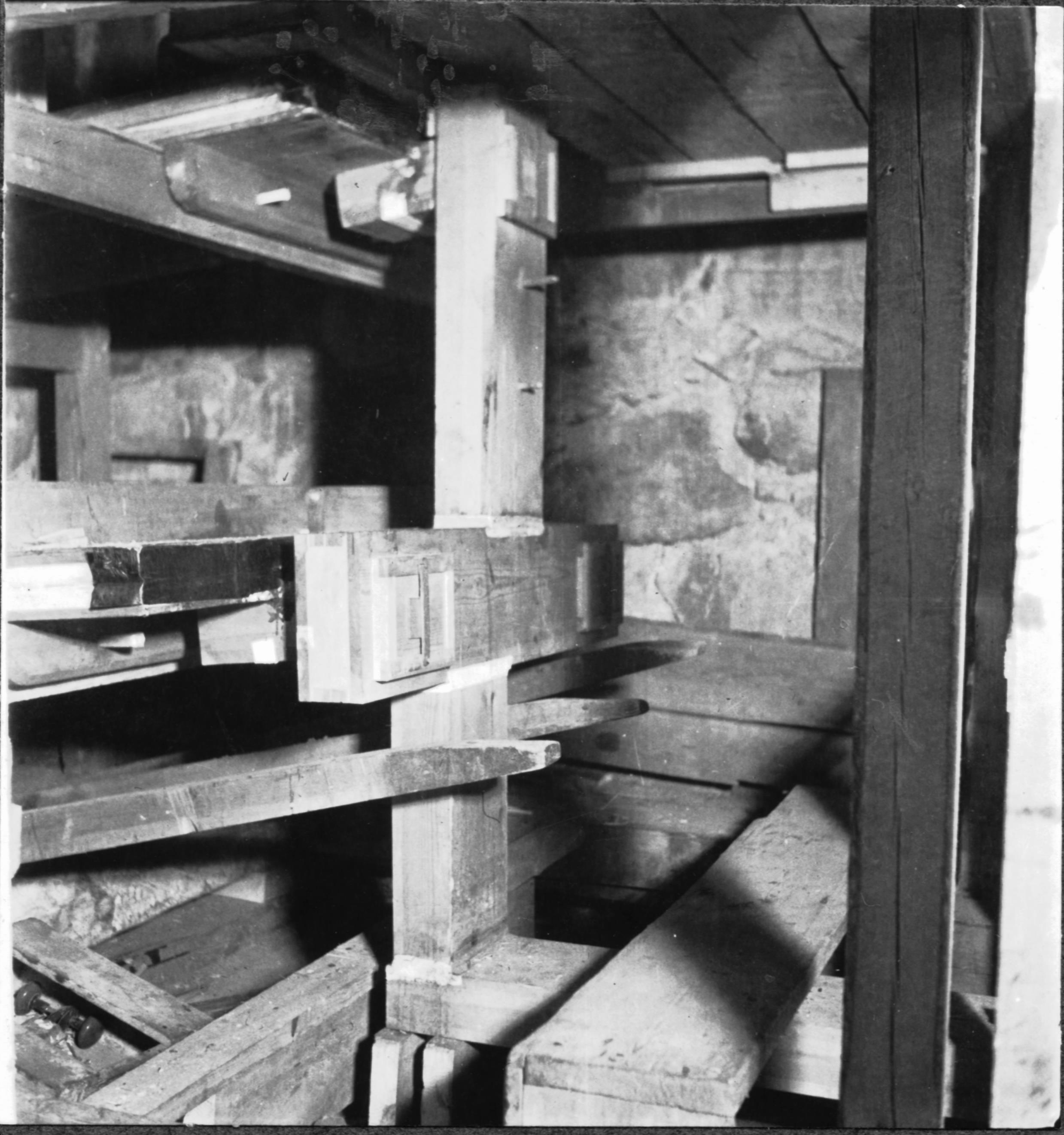 Gamla orgelverket av Johan Niclas Cahman, 1714. Bälgverket med tre stycken kilbälgar uppmonterade i tornvinden 1930-32. Foto nr. 2.