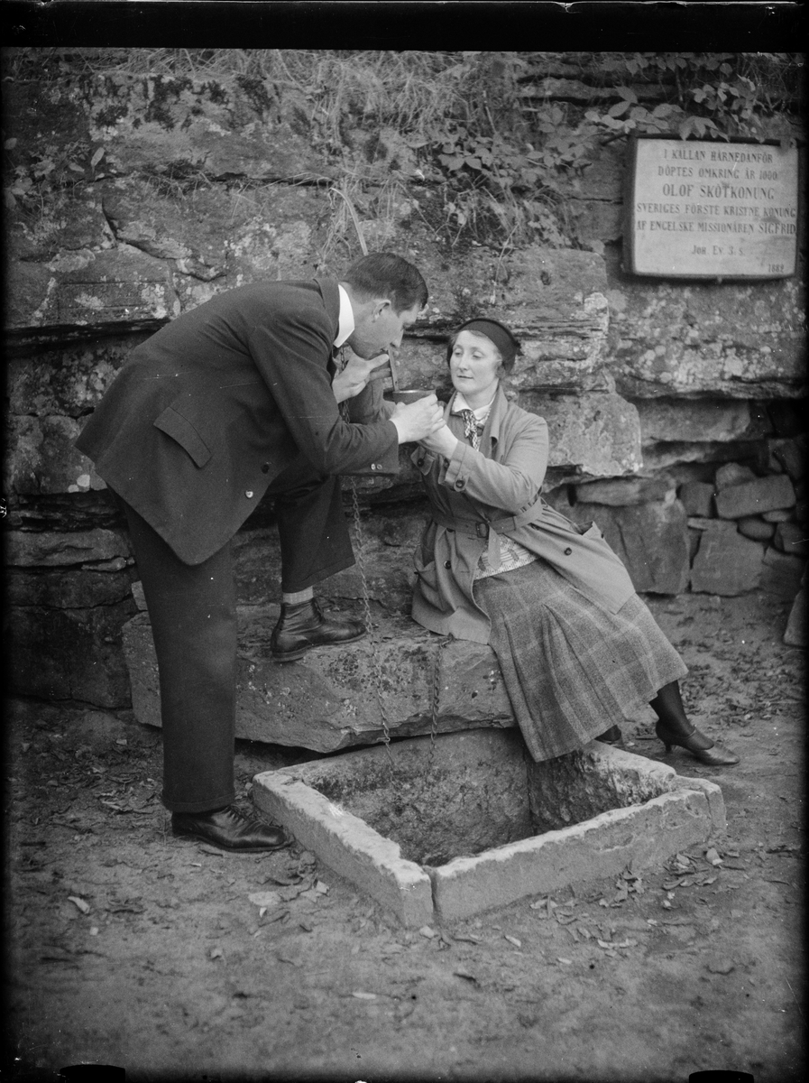 Josef och Sara Edhlund dricker brunn vid Sankt Sigfrids källa, Husaby, Västergötland