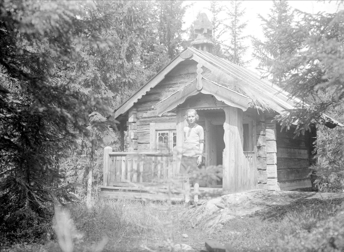 Flicka vid timrat fritidshus, Marielund, Funbo socken, Uppland