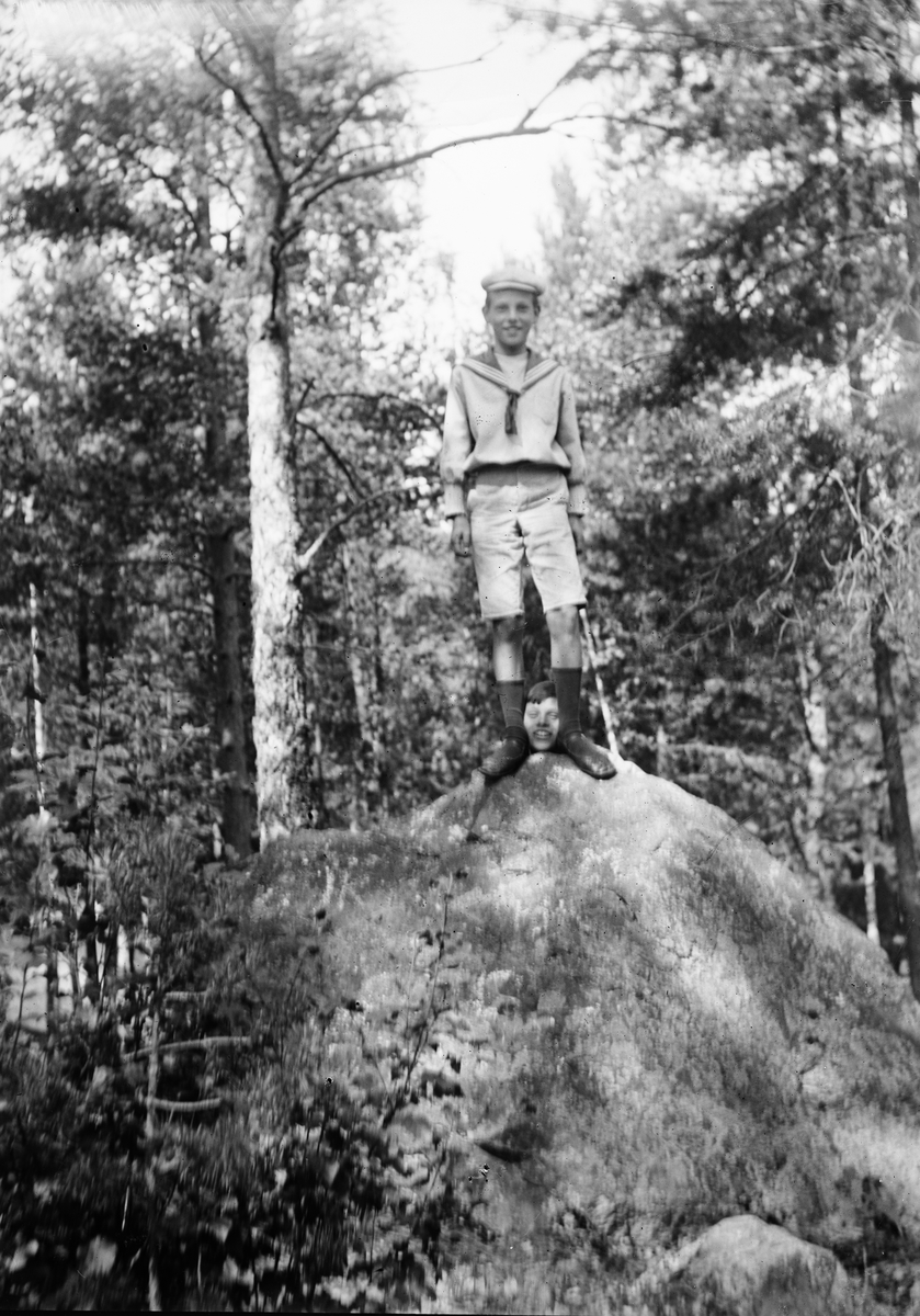 Ruben och Christine Liljefors söner Ingemar och Alf på ett sten i lövskog, i Sverige
