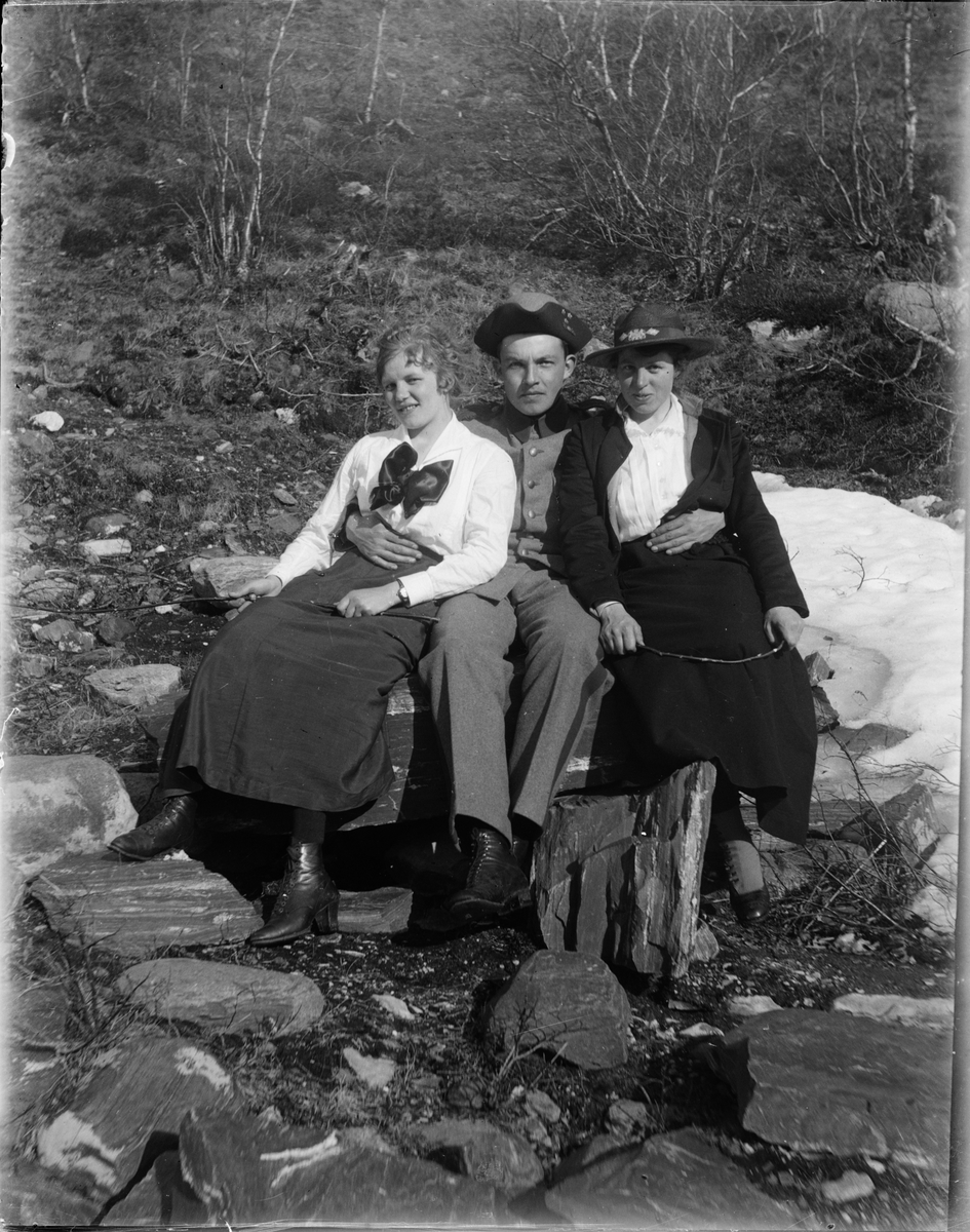 Man i uniform tillsammans med två kvinnor i fjällandskap, Boden
