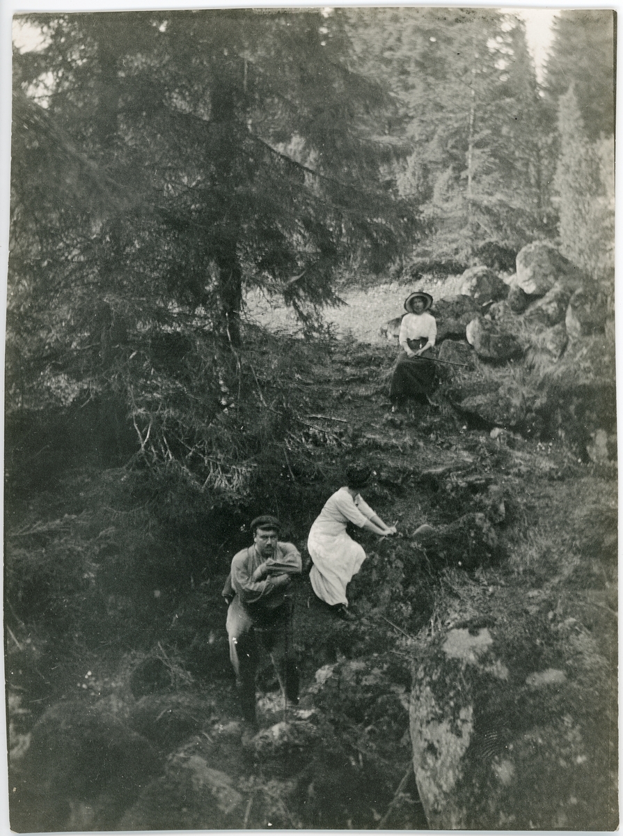 Olof Thunman på vandring med två kvinnor, Billinge, Uppland 1913