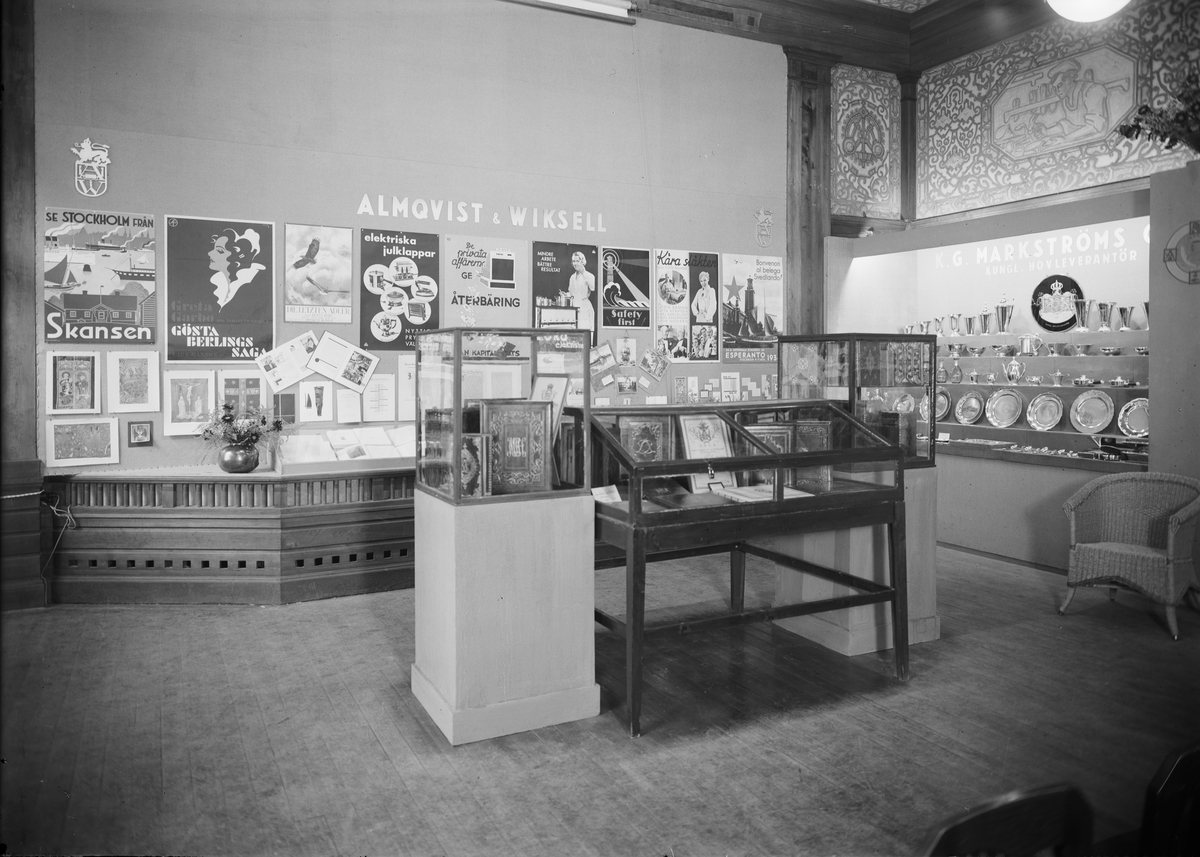 Almqvist & Wiksells Tryckeri AB:s och K G Markströms Guldsmeds AB:s montrar i stora utställningssalen på Upsala Fabriks- och handtverksförenings utställning, nedre botten, Nedre Slottsgatan 6