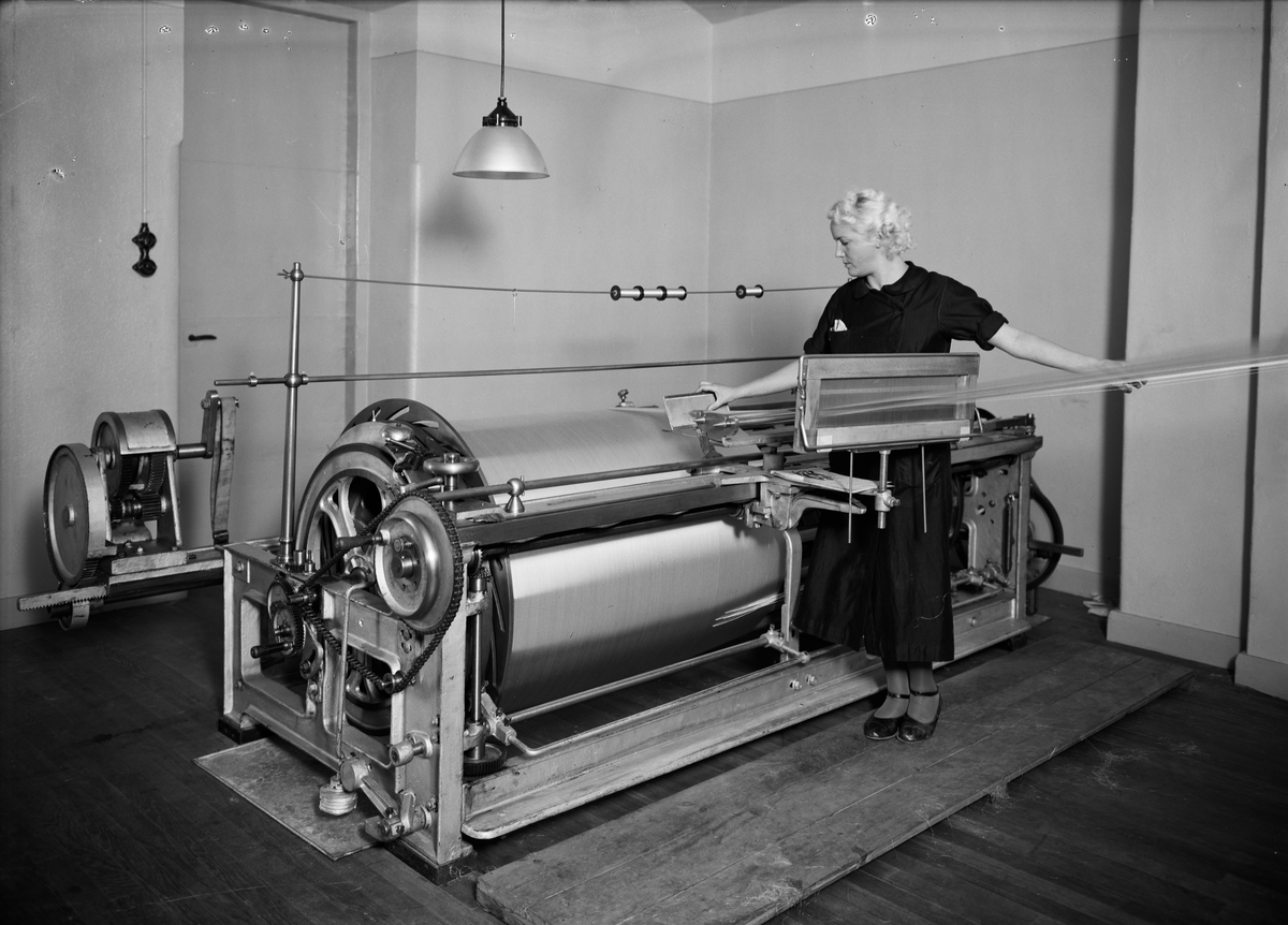 Kvinna arbetar vid varpmaskin, AB Upsala Sidenväverier, Suttungs gränd, Kungsängen