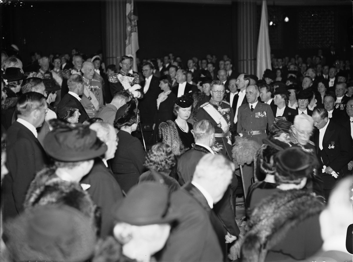 Kronprins Gustav Adolf, prinsessan Sibylla och kung Gustav V i samband med Karl Johansförbundets minnesbankett i Universitetsaulan